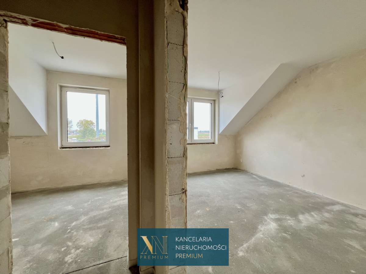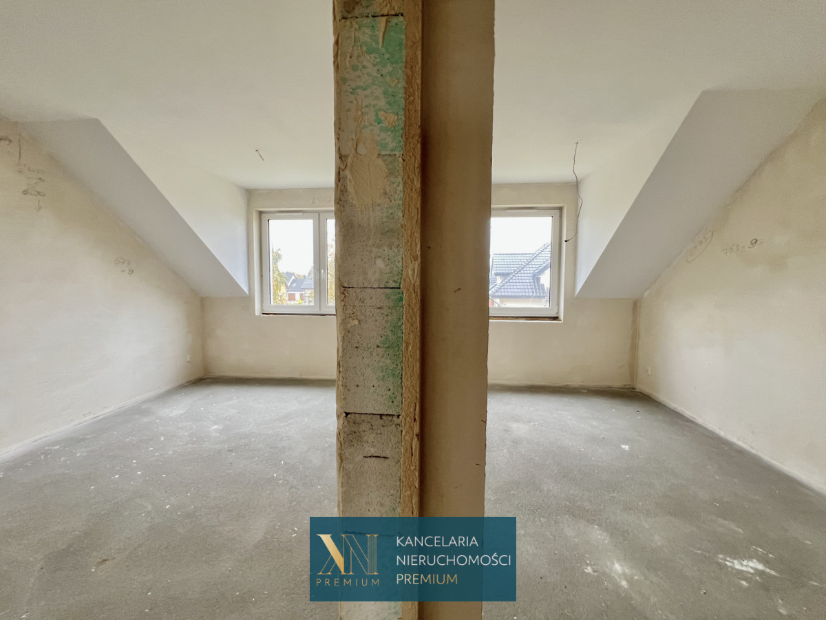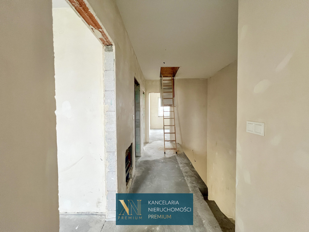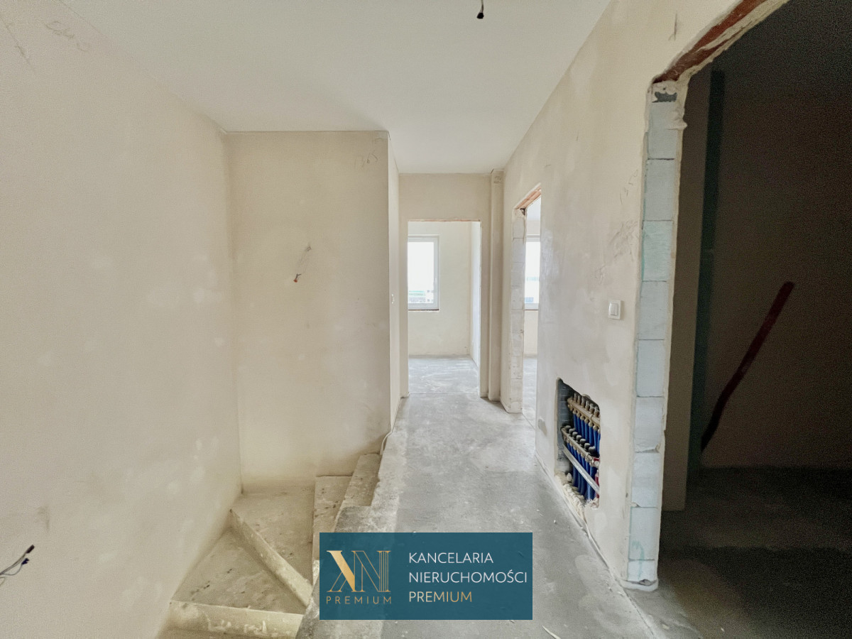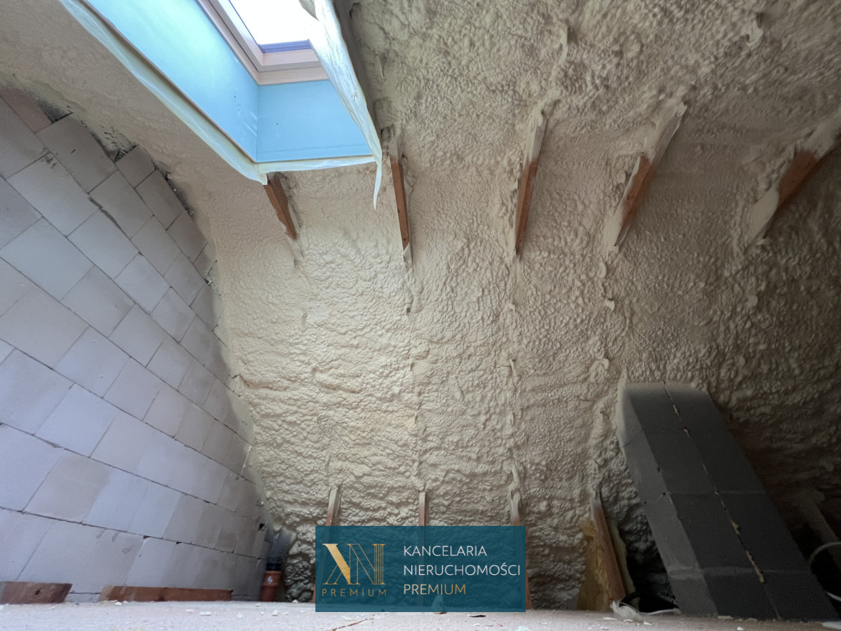 Budynek wykonano z 18-cm bloczków silikatu. Docieplenie 20-cm szarym styropianem, na strychu pianą. Wewnętrzne ścianki o gr. 12 cm. Strop żelbetowy typu TERIVA. W domu zastosowano wentylację grawitacyjną. Na obu poziomach ogrzewanie podłogowe. Ciepła dostarcza pompa renomowanej marki Viessmann. Duże przeszklenia zagwarantują piękne doświetlenie domu. Szerokie okno z roletą elektryczną w salonie daje wgląd na przyjemny ogród, który można urządzić wedle upodobań. Salon z kuchnią i jadalnią to około 29 m2 ustawnej przestrzeni. Nadto łazienka i wiatrołap z miejscem na garderobę wejściową. Na piętro prowadzą betonowe lane schody zabiegowe. Na nim znajdują się 4 pokoje, duża łazienka oraz przedpokój, a także wyłaz na poddasze, które może posłużyć jako dodatkowa powierzchnia przechowywania - ponad 30 m2. Do wykonania dachu konstrukcja w postaci więźby dachowej, a jej pokrycie to blachodachówka. Na elewacji znajdują się tynki silikonowe. Drzwi wejściowe antywłamaniowe. Elektryczna brama garażowa. Podjazd i droga wewnętrzna z kostki brukowej. Teren zabezpieczony ogrodzeniem panelowym.