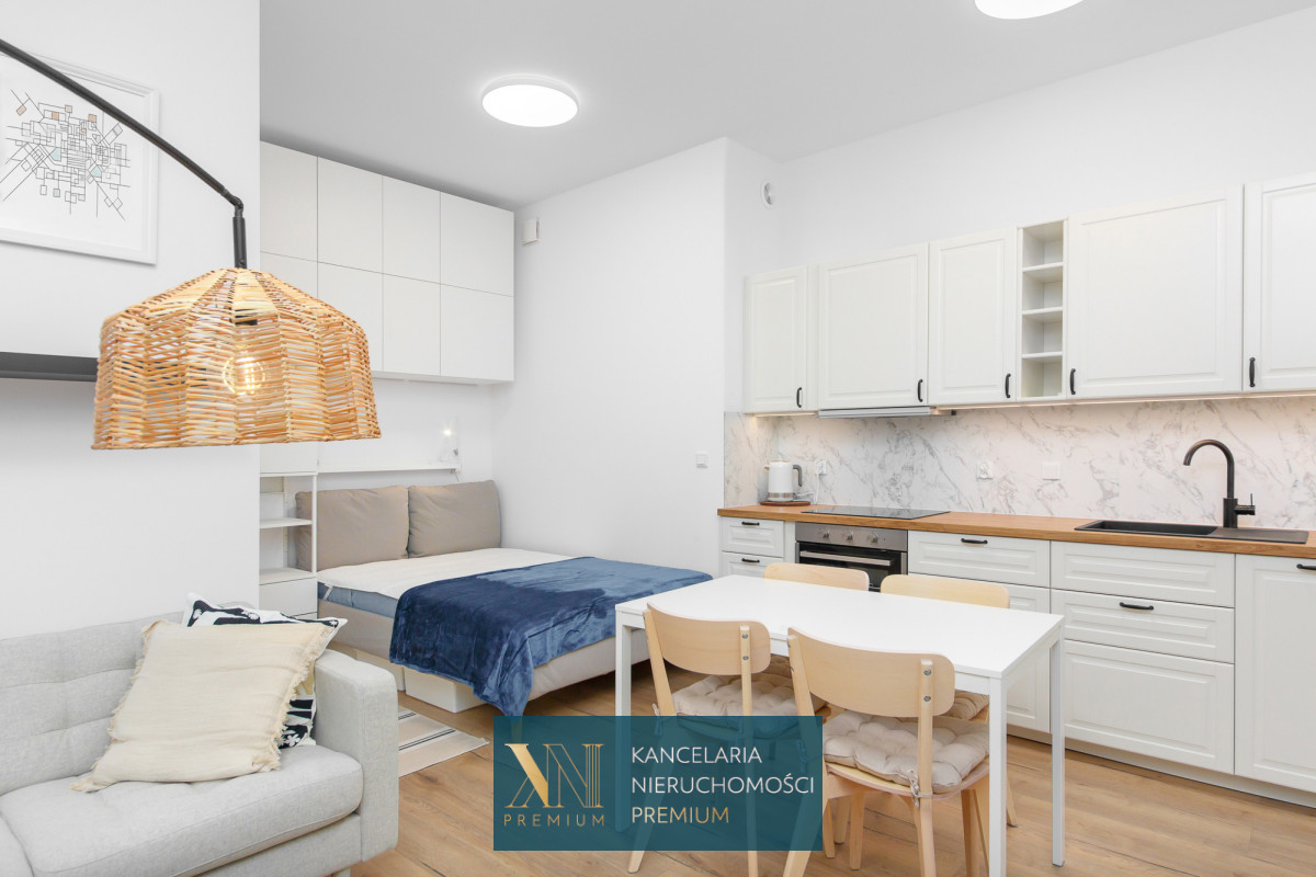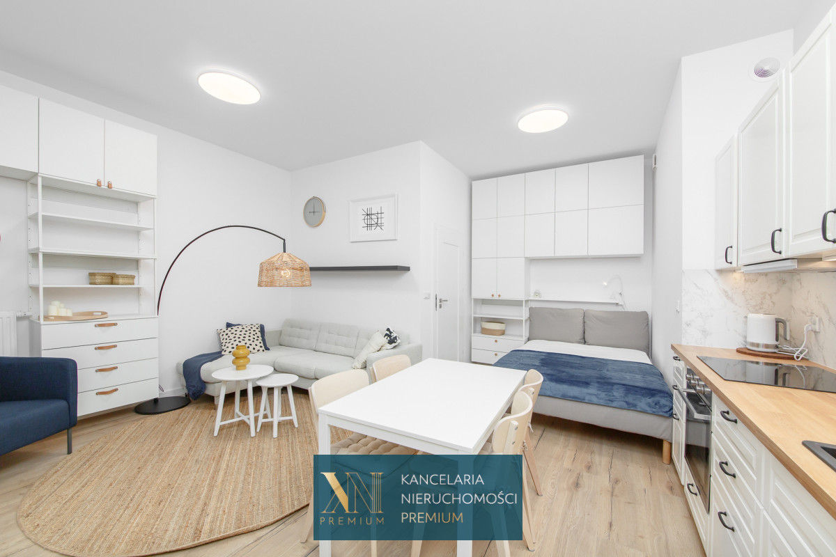 Powierzchnia 32 m2, część dzienna, wypoczynkowa wyposażona w sofę oraz szafki do przechowywania połączona z kuchnią w zabudowie wraz ze sprzętem; lodówka, piekarnik, zmywarka oraz płyta indukcyjna.
