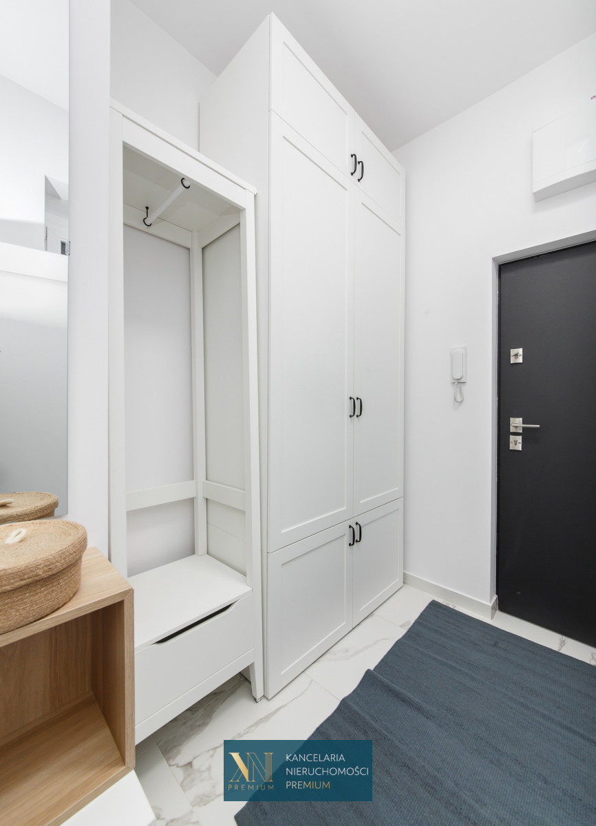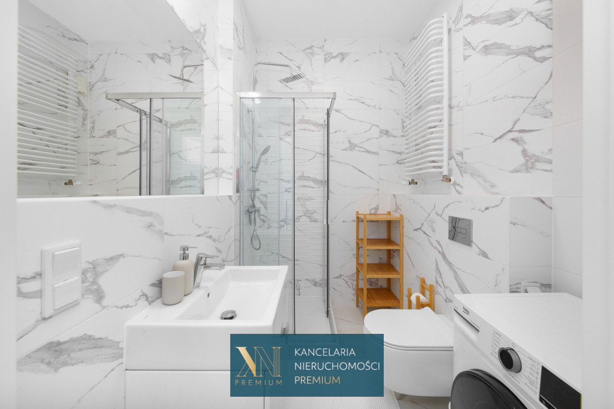 Łazienka z prysznicem, na wyposażeniu również pralka. Przedpokój z pojemną szafą na garderobę oraz obuwie.
