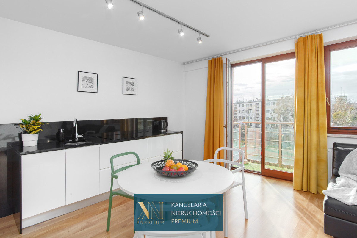 Powierzchnia 50 m2, salon połączony z kuchnią w zabudowie wraz ze sprzętem; lodówka, piekarnik, kuchenka mikrofalowa, zmywarka oraz płyta indukcyjna. Z części dziennej wyjście na niewielki balkon.