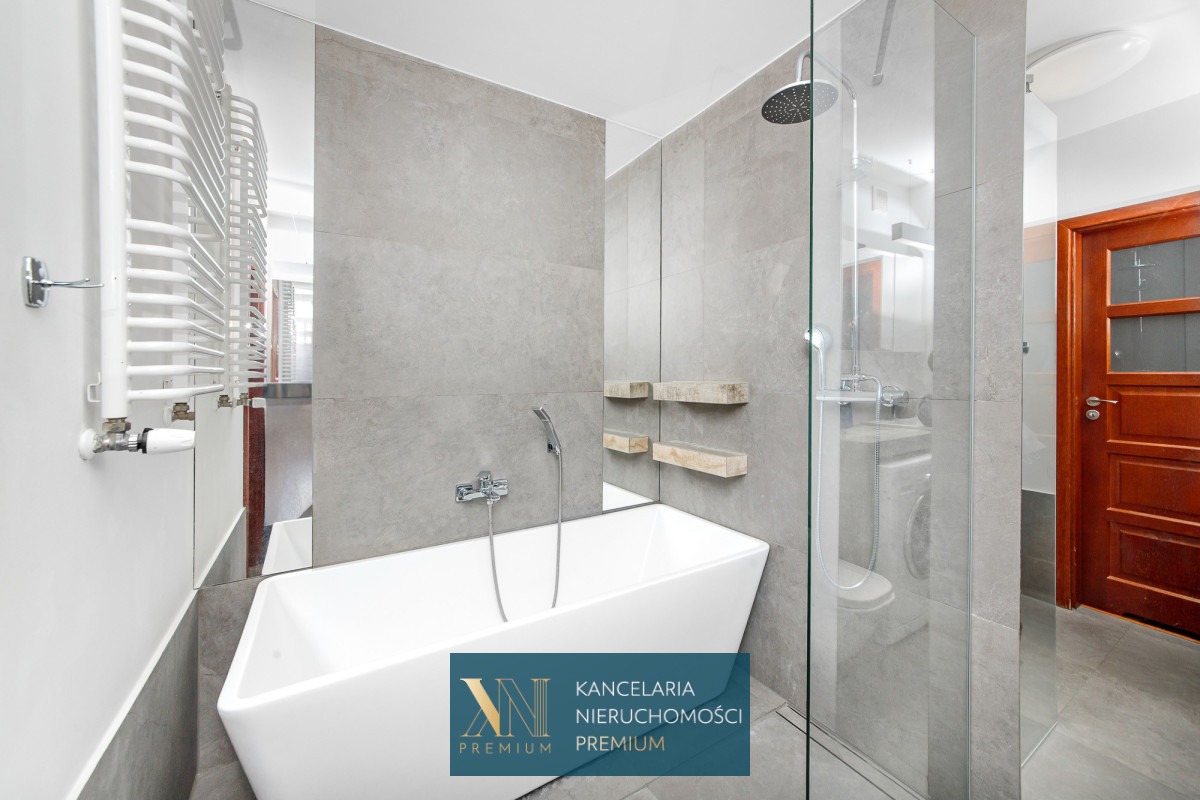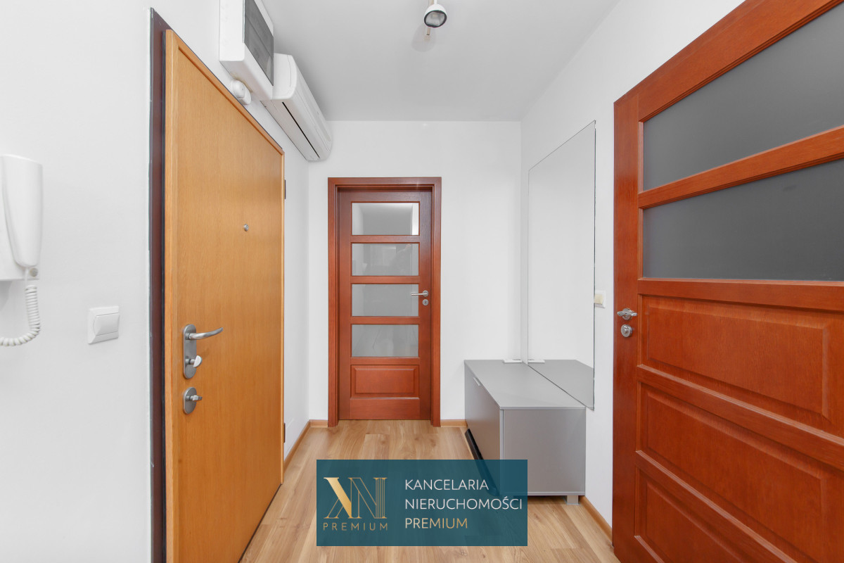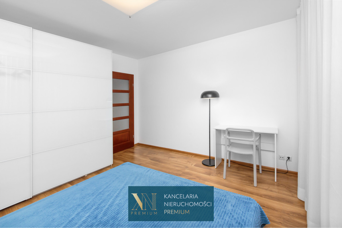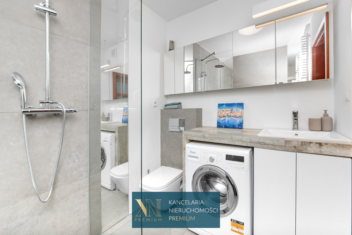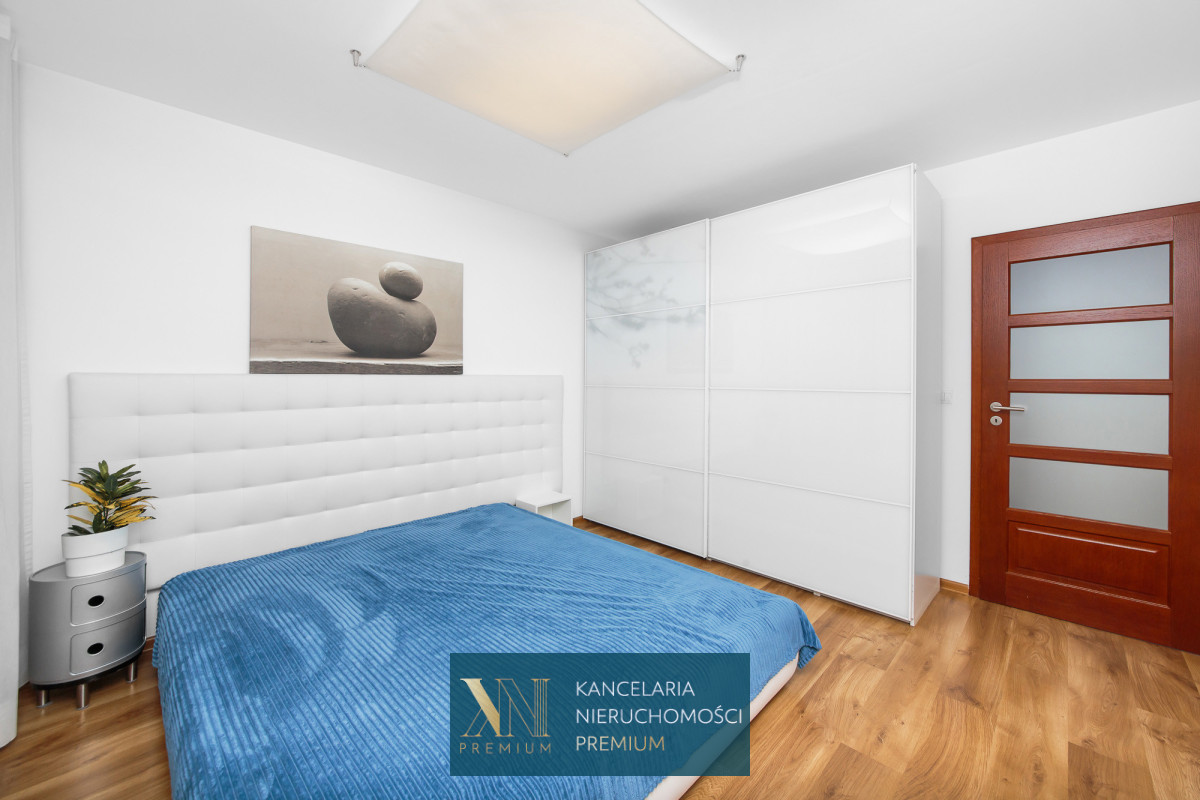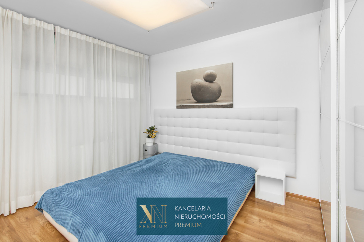 Sypialnia z dużym wygodnym łóżkiem oraz pojemna szafa. Łazienka z prysznicem oraz wanną, na wyposażeniu również pralka. W przedpokoju znajduje się jednostka klimatyzacji.